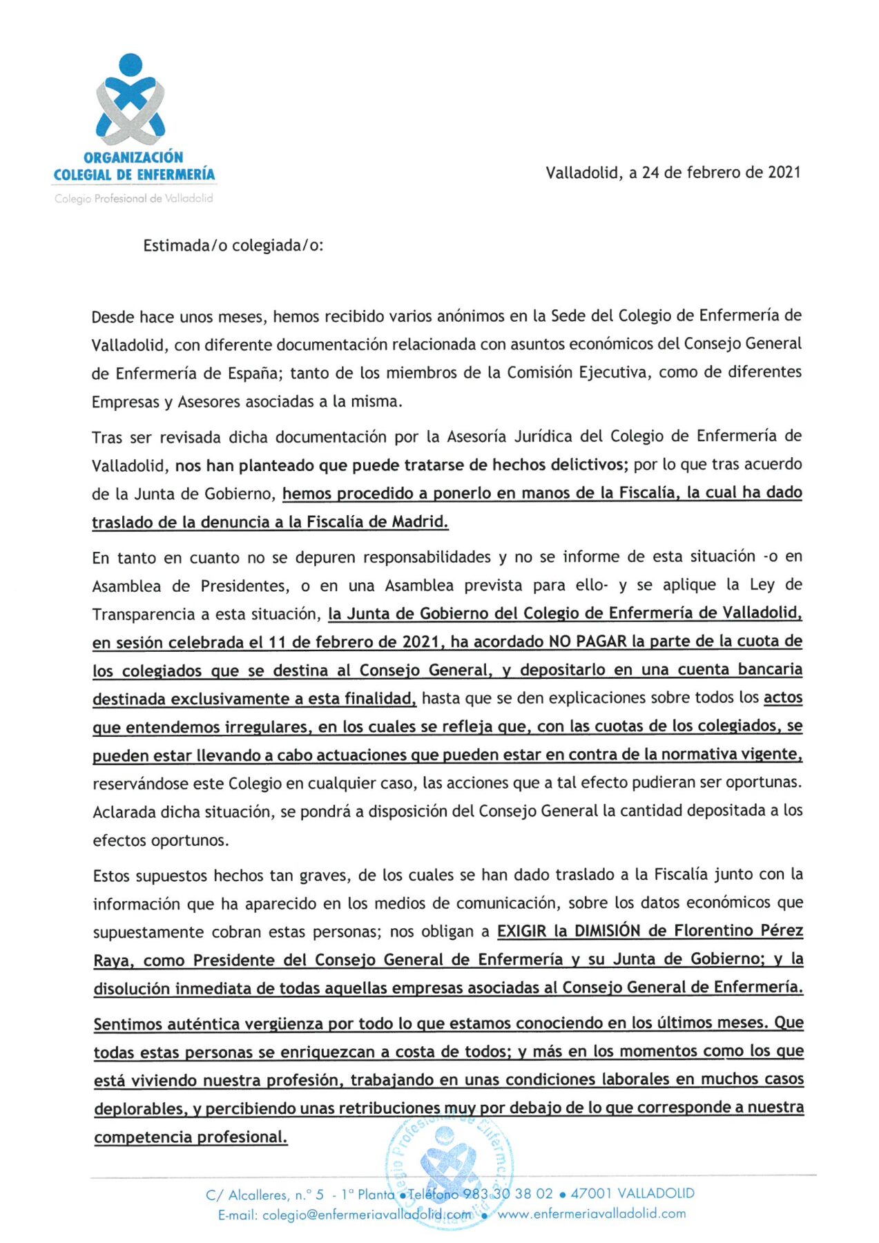 La Junta de Gobierno del Colegio de Enfermería de Valladolid, en sesión celebrada el 11 de febrero de 2021, ha acordado NO PAGAR la parte de la cuota de los colegiados que se destina al Consejo General, y depositarlo en una cuenta bancaria destinada exclusivamente a esta finalidad, hasta que se den explicaciones sobre todos los actos que entendemos irregulares, en los cuales se refleja que, con las cuotas de los colegiados, se pueden estar llevando a cabo actuaciones que pueden estar en contra de la normativa vigente.